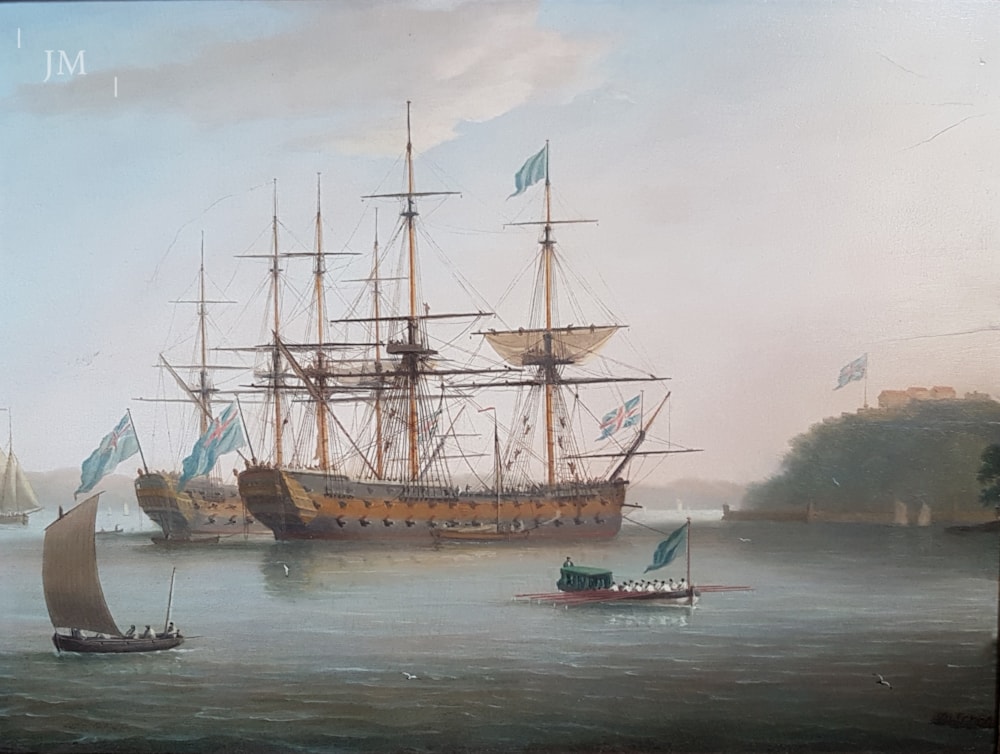 Two First-Rates at anchor, with the foreground ship and barge flying the flag of the Vice-Admiral of the Blue
