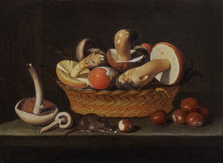 A still life with mushrooms, hazelnuts and a mouse