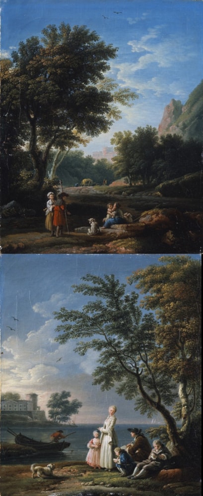 An elegant family by a Mediterranean shore; & Travellers in an Italiante landscape