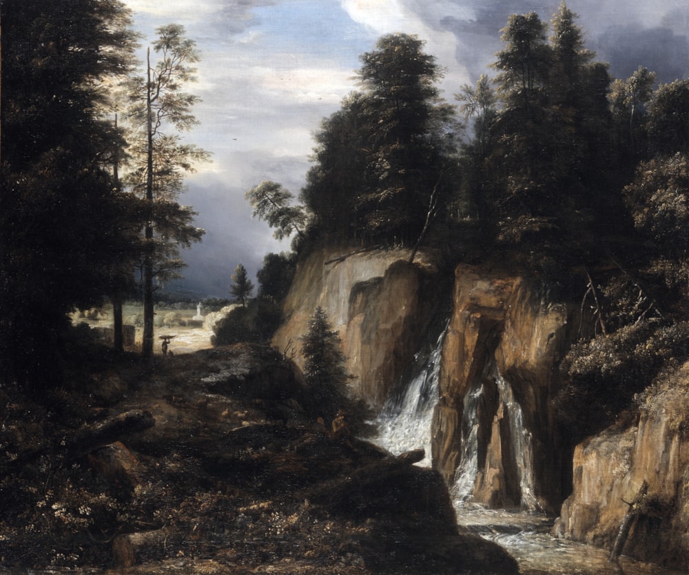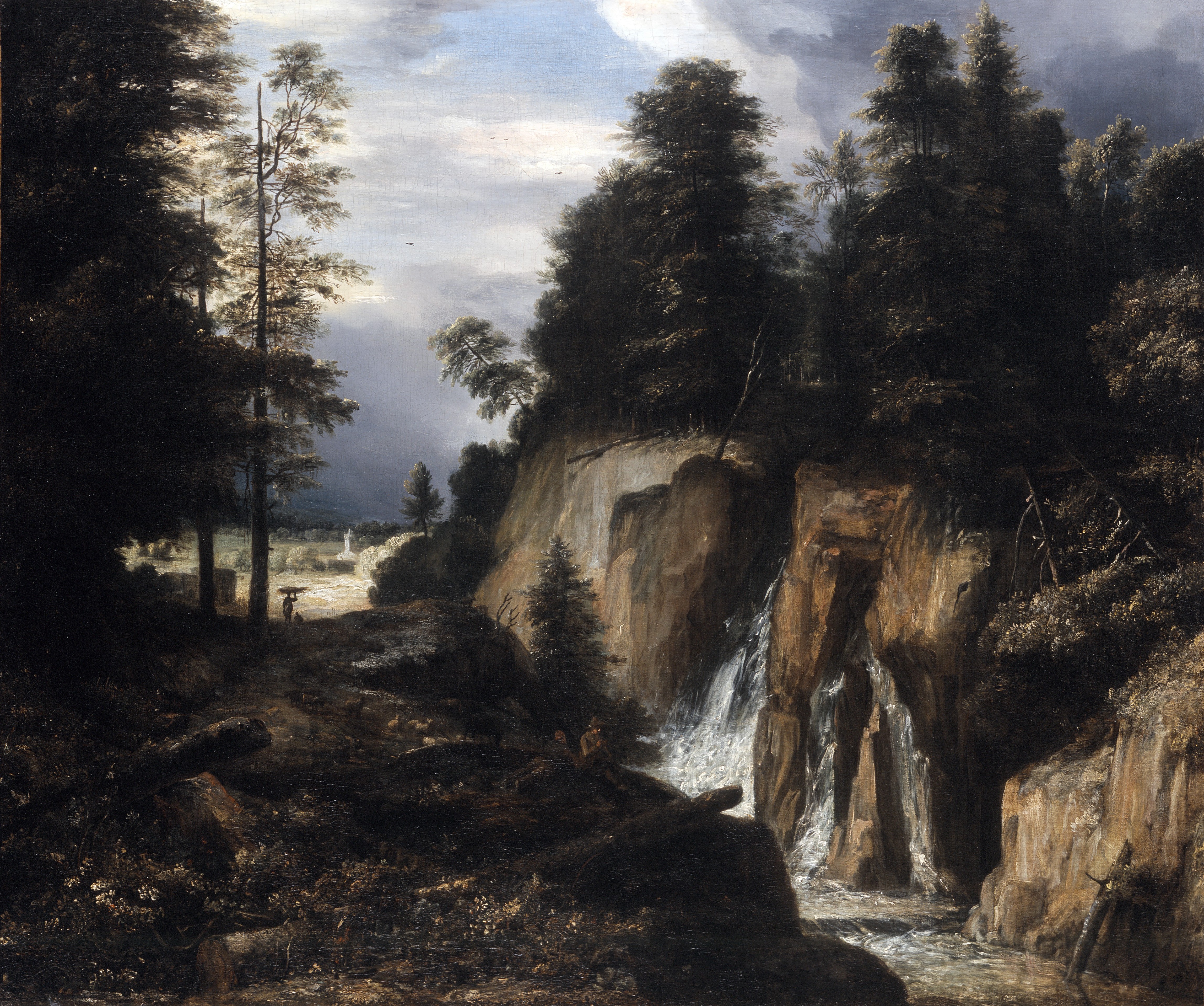 With most of his approximately thirty known paintings unsigned and, more importantly, all of them undated, much of our knowledge of Roghman’s oeuvre derives, unusually, from his mother – Maria Savery, Roelandt Savery’s sister. Named after his venerable uncle, Roelant most likely undertook his earliest tutition with this multi-faceted artist, Savery the ‘Rudolphiner’ whose paintings, etchings and drawings were fundamental to the development of imaginary landscapes depicting mountainous terrain. Without digressing, it would be misleading to omit the equally important status of Esaias van de Velde and Hercules Segers in propagating this genre of Dutch landscape. Loosely speaking, this first generation of painters put imagination centre stage with the ‘real’ in their landscapes. Moreover, whilst the 1630s and 1640s were dominated by the renown of the tonal periods of Jan van Goyen and Salomon Ruysdael, there was a resurgence in the Alpine- or Scandinavian-inspired scene by the 1650s. Our Rocky landscape with a waterfall goes beyond the realm of the everyday, supplementing it with drama and emotion.