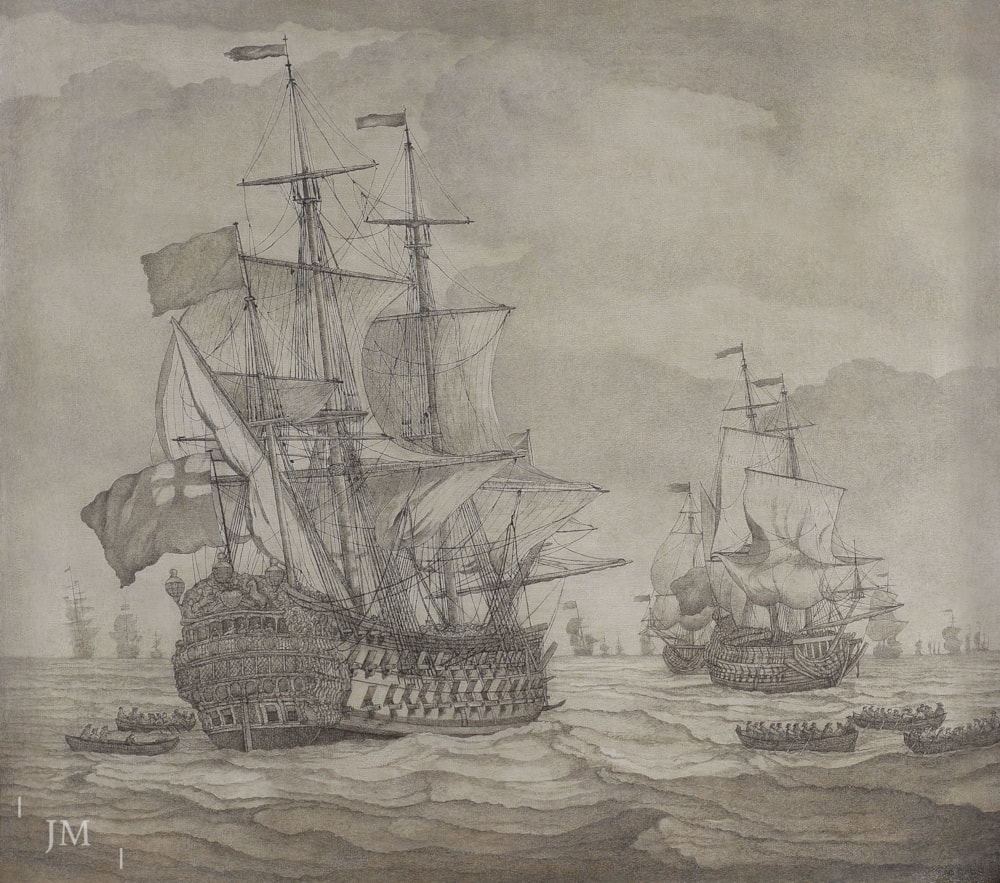 A major exhibition on the Van de Veldes, father and son, has just been held at Greenwich in the very building where they set up their studio under the patronage of King Charles II. No fewer than eight of the father’s ‘penschilderij’ were on display – as if to remind one of their stature at the very top of a wishlist for lovers of marine art!