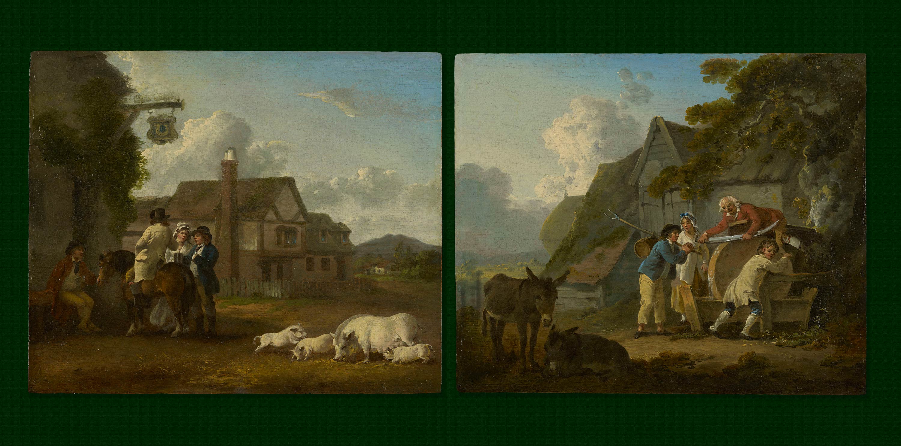 In these oils, dating from the 1790s, one finds the artist at his best, and, even when working on a small scale, his style is assured, precise and the results most pleasing. Artisans like the knife-grinder seen here were of continual interest to Ibbetson’s keen eye, and this character belongs to a rich tradition in the artist’s work of depicting villagers at work, or gathered in town squares. In this vein, his numerous pictures of cottage industry in Wales come to mind – a notable example being Llangollen, peasants spinning (Cardiff, National Museum of Wales, inv. A504). Similarly, the figures grouped around a single, mounted traveller outside an inn are another regular feature in Ibbetson’s oils and watercolours. Cleaning has revealed both the tavern sign, with its distinctive horseshoe motif, and the seated toper underneath. It is tempting to think that this is meant to be the painter himself, as he was no stranger to such places! The donkeys and pigs in each picture are drawn with the skill and affection with which Ibbetson invariably treats these beasts, and his distinctive ‘Berchem’ palette of prussian blue, naples yellow and crimson lake set off the figures agreeably. It would be difficlut to find a better pair of small Ibbetson oils from this, his most fruitful period.
