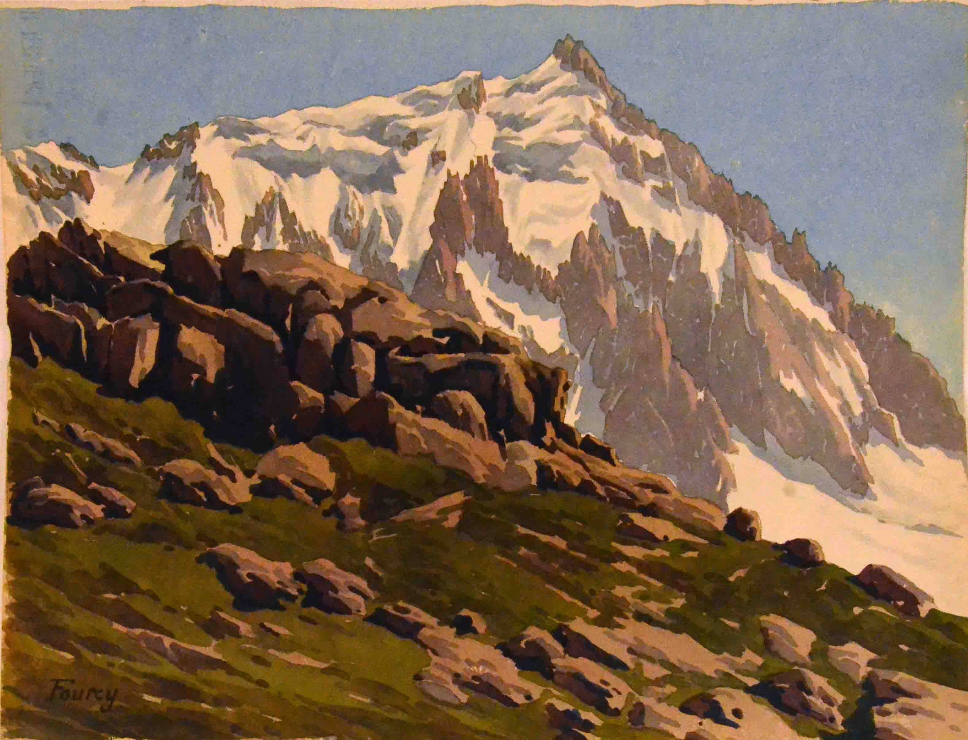 This watercolour comes from an album Fourcy produced in August and September 1958 when he divided his time between Chamonix and Zermatt. An arguably trickier medium to work in than oil paint, Fourcy displays his usual confident bright colouring and values in these watercolours. Despite the snowy summits, his summery palette somehow brings through the heat coming from the valley floor and surrounding meadows.
