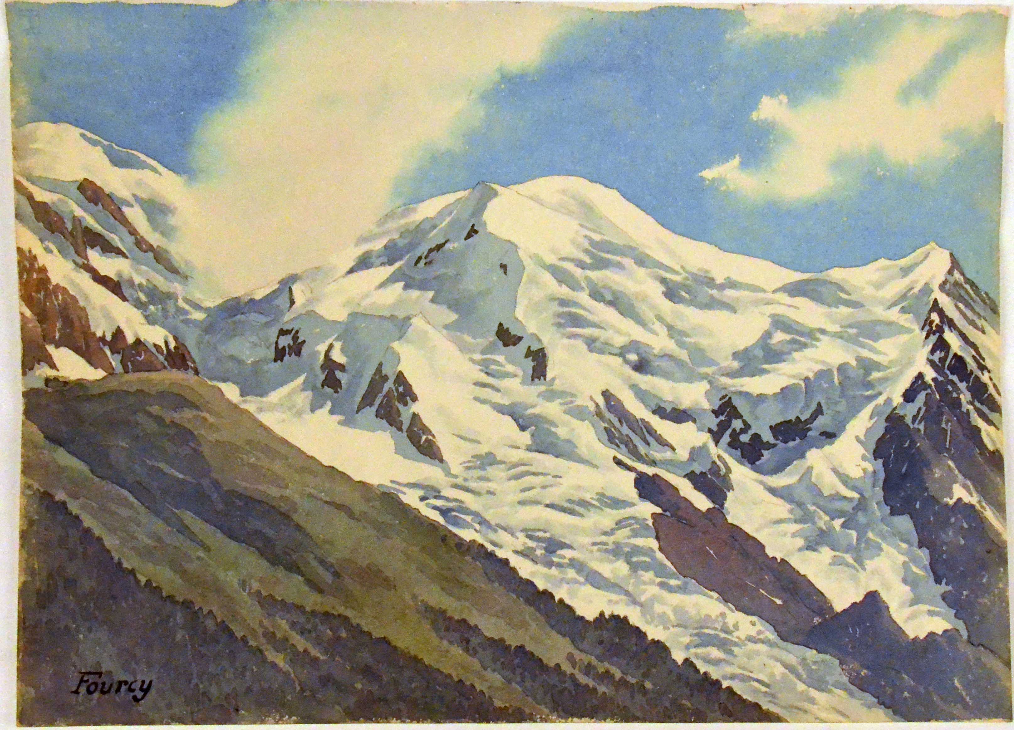 This watercolour comes from an album Fourcy produced in August and September 1958 when he divided his time between Chamonix and Zermatt. An arguably trickier medium to work in than oil paint, Fourcy displays his usual confident bright colouring and values in these watercolours. Despite the snowy summits, his summery palette somehow brings through the heat coming from the valley floor and surrounding meadows.