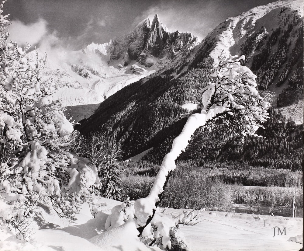 Winter in Le Praz with the Aiguille de Dru, Chamonix, France.