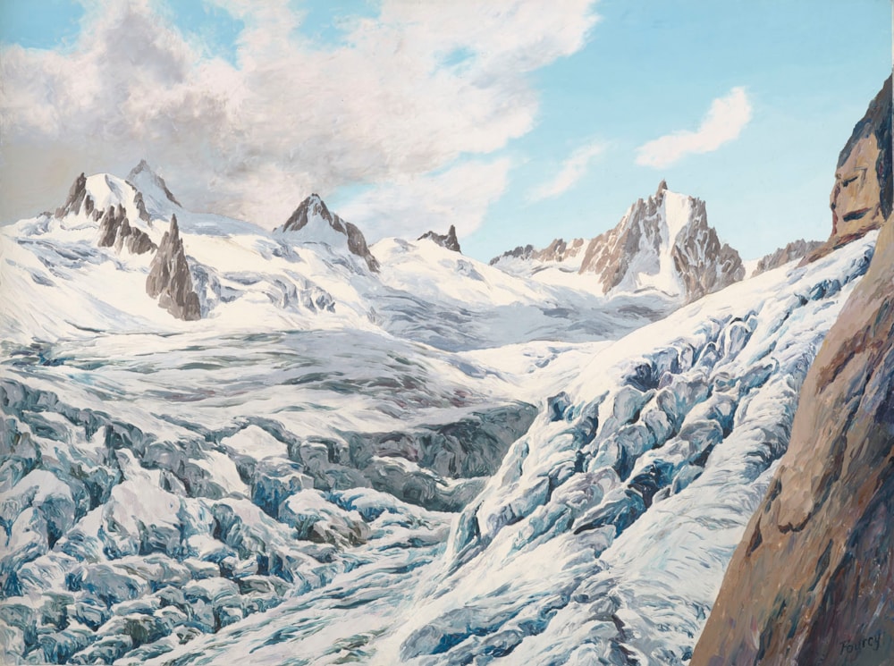 Fourcy learnt to paint by himself. He relied exclusively on a palette knife generously loaded with paint to recreate the seracs, glaciers and couloirs so familiar to him as a peintre-alpiniste. His unusual technique proved highly successful; it meant too he could create blank areas of smoothed over paint broken up by thick layers and whorls of impasto. On close inspection, and with fingertips, the paint surfaces ripple with eddies and lines and yet it took considerable skill to avoid over saturating the colour and tone. Fourcy’s experience from a lifetime’s climbing gave him, like Loppé in particular, an advantage in calculating the strength of shadows at altitude; his foregrounds tend to juxtapose the receding composition perfectly. In this instance, the spiky Aiguille d’Entrèves and the Tour Ronde far off to the right seem an appropriately long way away across the tumbling ice-fields.