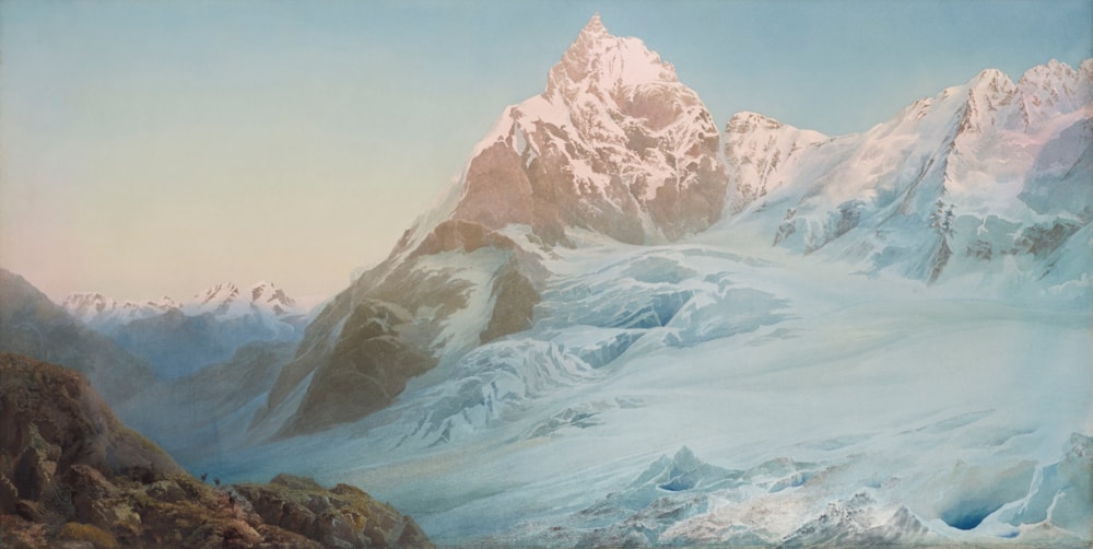 A late afternoon light is catching the upper half of the Matterhorn’s west flank in this remarkably well-preserved Victorian watercolour. Of its four faces, this side of the peak, the Zmutt Ridge, is the least familiar to artists and photographers and the one that awaits skiers when completing the traditional Haute Route. Arthur Croft’s view was taken from low down on the Stockji Glacier looking across the Tiefmatten Glacier to the Matterhorn. The distinctive, flat Pic Tyndall (4241m) is to the right of the summit on the Lion Ridge separated from the final pitches by a huge cleft that defeated John Tyndall’s summit attempt in July 1863.