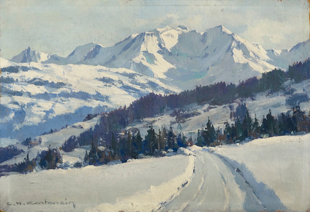 Contencin’s inventive motif of sled tracks in the foreground comes into its own in this superb wintry view looking towards Mont Blanc. The path ploughed through the heavy snow draws the viewpoint down and through to the darker, wooded valleys beyond and the pictorial space is then dominated by the Mont Blanc Massif in the background. The simple and bold handling of the wide, established snow in the foreground is the key to this composition’s success.