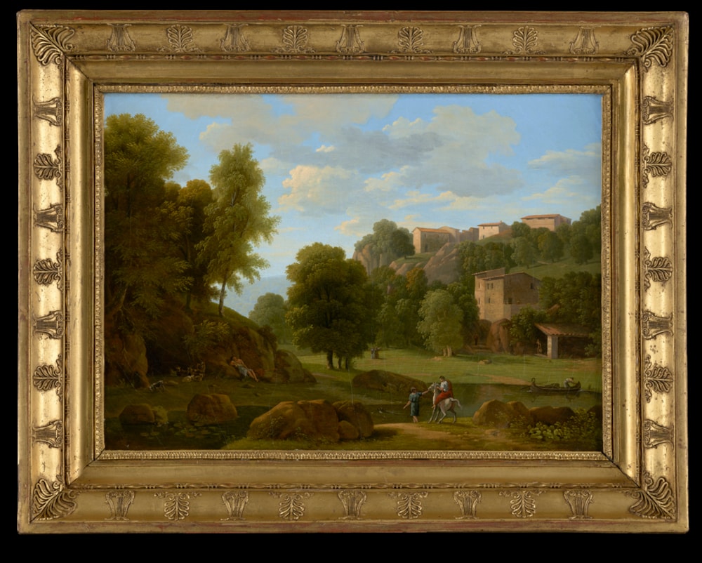 This hitherto unpublished landscape by Jean-Victor Bertin depicts a classical fantasy or capriccio. Within a carefully constructed composition we see two men in classical dress, one on a horse, the other leading the reluctant animal towards the river. To the left resting on a bank under the shade of some trees a shepherd reclines, his flock nearby. To the right a fisherman moors his boat to a post on the riverbank. In the distance two figures walk together along the valley, while others seek comfort in the shade, or mount the steps to the hilltop village beyond.