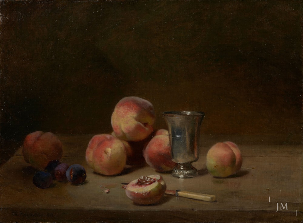 This painting, made the year before he died, shows Rousseau’s mature understanding and debt to the great eighteenth-century master. Gone are the opulent and decorative displays of his earlier works, instead the palette and composition have been refined to a masterful play of contrasts; the velvety skins of the peaches against the polished silver of the goblet, the over ripe figs opposite the freshly cut fruit, and the knife, that invites the spectator to participate in this still and silent world. Chardin’s accomplishment was to ‘marry object and atmosphere in an intimate union which makes the space of his pictures a private place, ultimately serene and inaccessible”1 and there is little doubt, looking at this painting, that Rousseau, at the end of his long career, saw the achievements of the master he most admired fully realised in his own work.