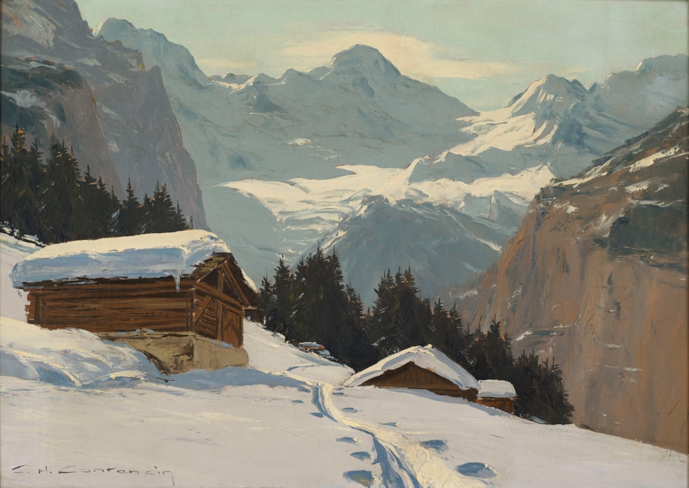 The artist’s inventive motif of ski or sledge tracks comes into its own in this beautiful scene painted above Wengen. With so much sunlight playing over the valley and the snowfields below the ‘Lauterbrunnen’ Breithorn, a thaw seems imminent. In a masterly manner, Contencin used his dark line of trees to cut the view in half pictorially; to conjure the sense of a vast void beyond before one’s eye alights on the rocky wall across the valley. Despite its relatively small format, this painting is complex but highly successful and one where the painter has favoured using the wooden panel’s ‘ground’ as a colour intermittently. However, as is often the case in Contencin’s pictures, the confident handling of the old snow in the broad foreground is the key to both the composition’s success and its visual appeal.