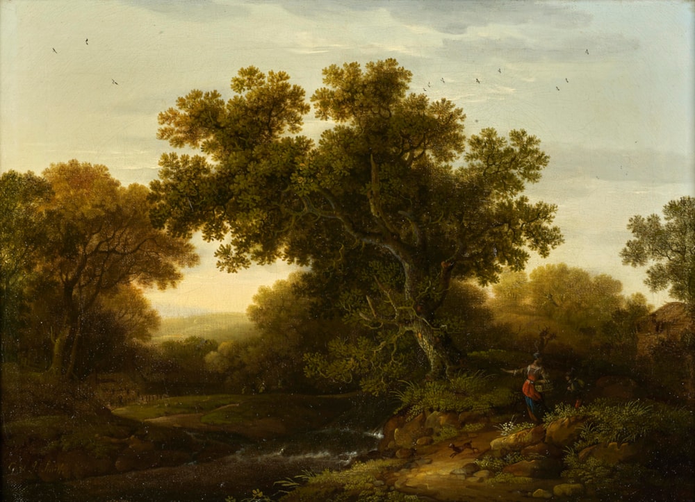 The smaller, rural landscape here holds much charm, and from his treatment of foliage and his fine variations of darker hues, it is clear that Smith had studied not only Claude, but the great Dutch landscape painter, Jacob Ruisdael (1628-82). Yet, whatever the influences from abroad, Smith is unmistakably English in the mood of his Sussex landscapes. A note of particular interest is that this painting is the only known, signed example of the recorded collaboration of the two brothers.