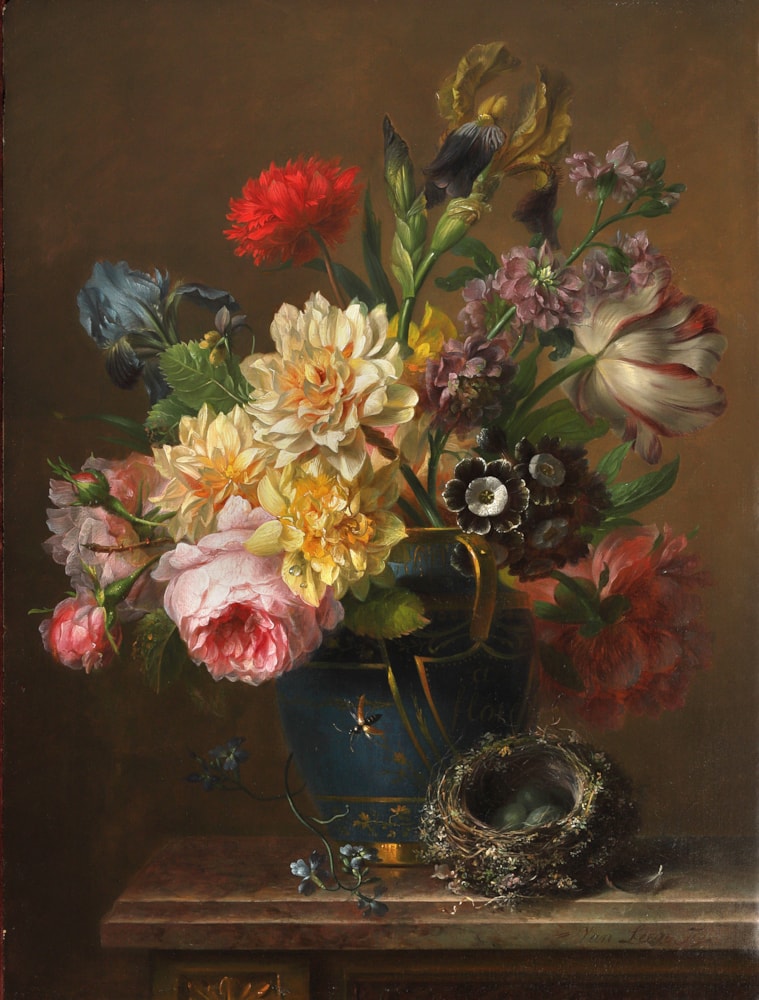 Although his palette was similar to van Spaendonck, van Leen had a softer touch with his brushes and often included a loose stem or spray of flowers into his compositions. This flowerpiece is similar in colouring and composition to van Leen’s painting in the Fairhaven Bequest at Cambridge’s Fitzwilliam Museum.
