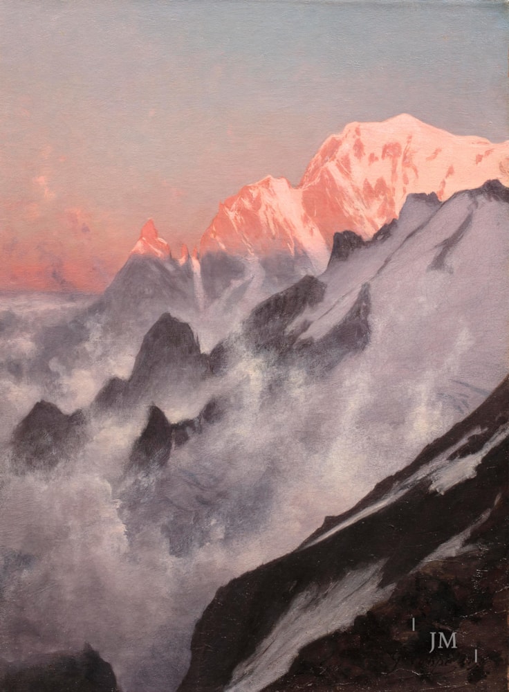 oil on canvas, 20 x 14in (51 x 35.5cm) signed and dated 1890 inscribed on verso: Sur le col du Géant – Soleil levant sur le Mont Blanc, Les nuages attires par la chaleur montent du fond de la vallée de Courmayeur sur les cimes – Italie. Peaks & Glaciers 2019, p. 30