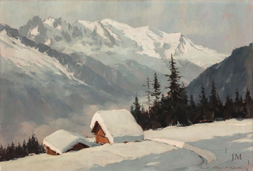 Contencin painted this view of Mont Blanc from between Le Col des Montets and La Flégère on the south side of the Chamonix valley. The sweep of cart tracks going down past the snowbound hay lofts draws the viewer’s gaze into the composition. Equally, the hazy sky above the peaks softens the atmosphere to enhance the sense of distance beyond the stands of fir trees. Throughout his mountainscapes, the painter excelled at creating great depth and in this instance, high up over the cloudy valley, soar the tops of the Aiguille du Plan, the Aiguille du Midi and those of Mont Blanc several miles away.