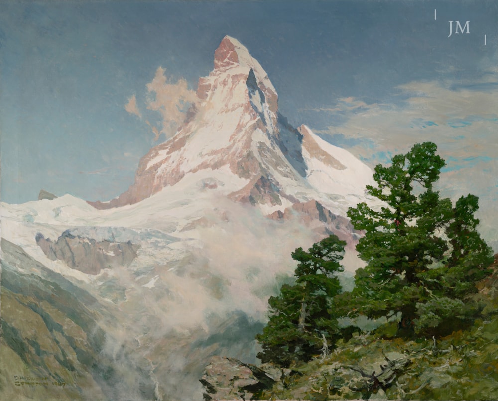 The walk or train ride from Zermatt to Riffelberg offers the finest and most iconic views of the Matterhorn’s ‘Hörnli’ ridge. In the seventy years since Compton produced this summery ‘portrait’of the Alps most famous emblem, the wide snow field straddling the base of the Matterhorn’s south-east face has all but disappeared just as the glacier on the Zmutt Ridge to the north has shrunk considerably since the 1980s. Curiously, the peak’s four sides face the four cardinal directions: north, east, south and west and it is undeniably a remarkable mountain, composed of gneiss rock. Geologically speaking it is classed as a‘cirque’. Despite Zermatt’s relative remoteness, Whymper’s conquest of the Matterhorn in 1865 became a cause celèbre. It abruptly concluded one era in mountain-climbing, making way for a more recreational approach rather than one of perpetual conquest. The accident didn’t kill off climbing but the mountain’s notoriety would turn Zermatt into another mecca for British tourists - as Mont Blanc had done for Chamonix; by 1880 the Matterhorn had been climbed 159 times: 132 ascents were made from the Swiss side and 27 from Italy. In 1960 the Matterhorn’s silhouette, seen from this angle, was adopted by the Swiss chocolate maker, Toblerone.