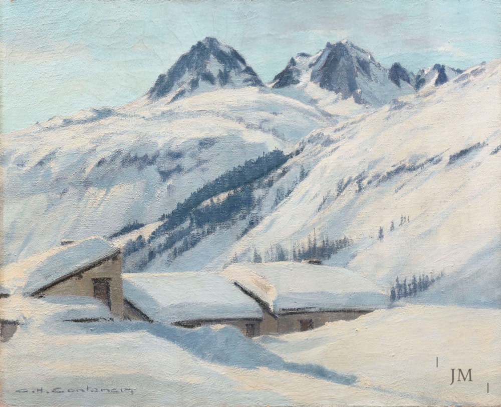 Located between Argentière and vallorcine, today Le Tour is still a relatively peaceful village in marked contrast to its neighbouring towns in the Chamonix valley. Looking south to the Aiguille d’Encrenaz and the Aiguille de Mesure, Contencin made this painting after a heavy snowfall. In February 1999 nearly five metres of snow fell around Le Tour in the space of just two weeks resulting in a huge avalanche. It devastated many lives and blighted the aspect of the hamlet for evermore.