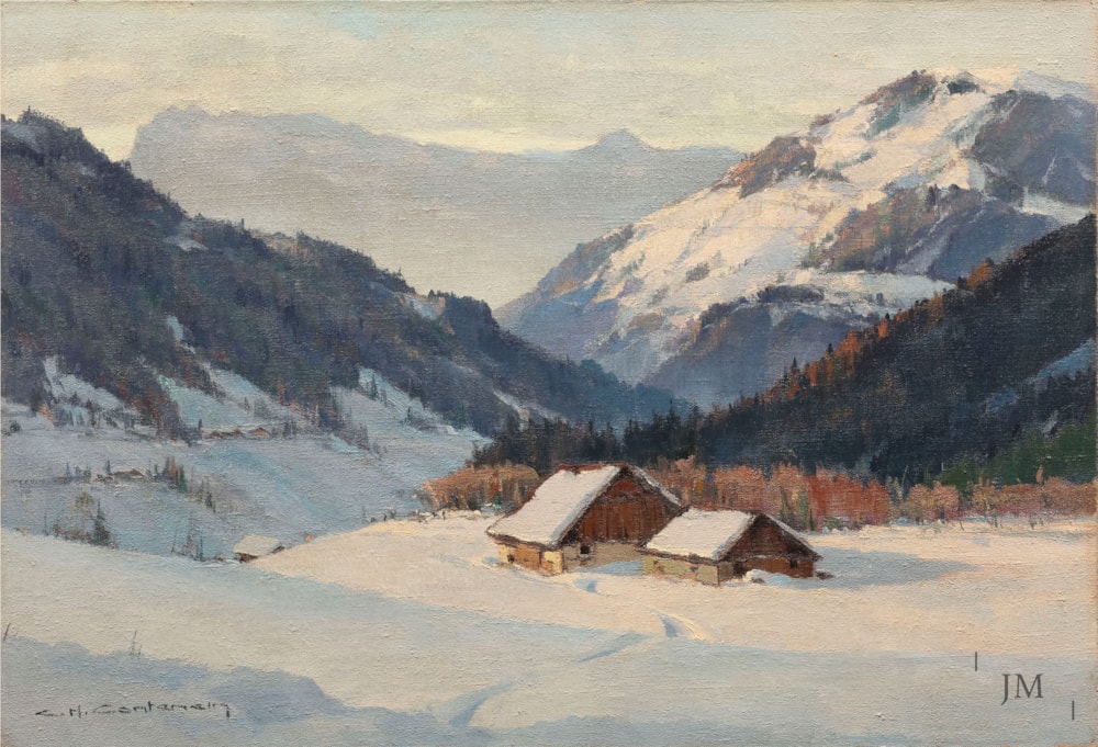 Les Contamines-Montjoie lies in a secluded valley between Megève and Chamonix. As well as a fine Savoyard church from the Baroque era, many of its original buildings still stand, especially its barns and haylofts, and a 15,000-acre nature reserve was set up in the 1970s to protect the area. In this late afternoon scene Contencin has conjured the essence of a winter coming to an end. The lingering snows on the farmhouses have begun to thaw and a stand of tawny coloured larches add warmth to the composition. A patch of mist is catching the dwindling sunlight further down the valley and subtly pushes the long chain of the Aravis mountains deep into the background.