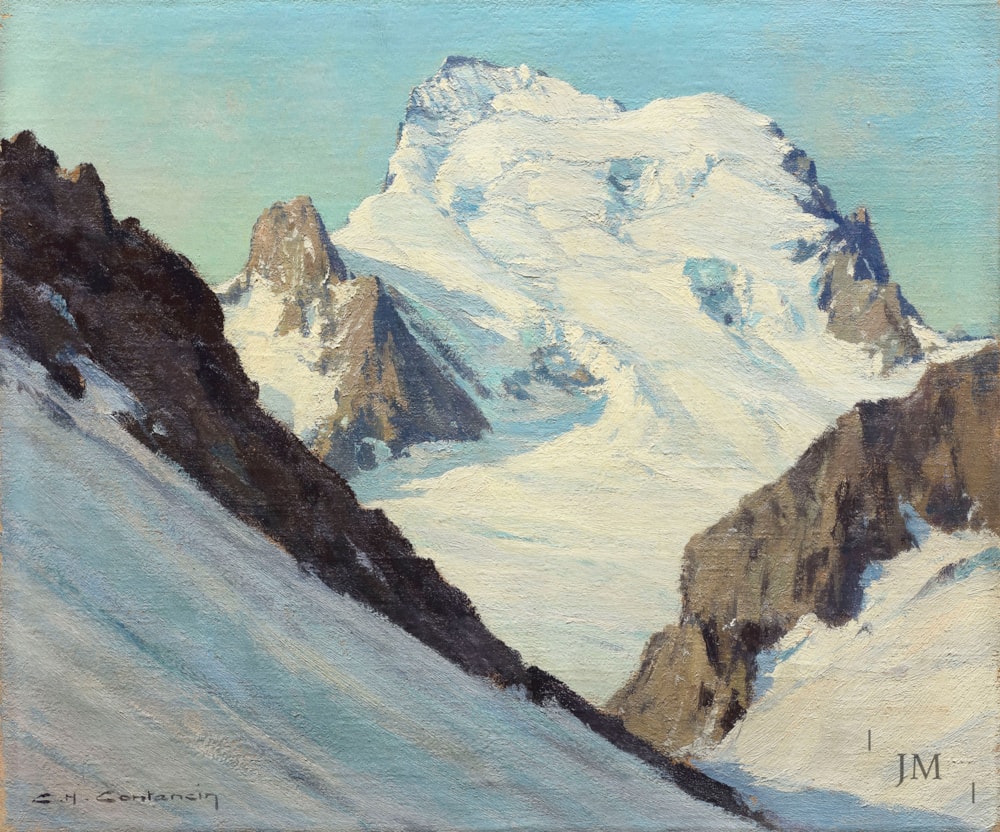 The mountains that form the Massif des Ecrins rear up in the western French Alps, in a region known as the Dauphiné. Contencin returned to the area many times during his painting and climbing career and the Ecrins’s peaks still offer some spectacular climbing with a lighter footfall of visitors in the late summer season. The Glacier Blanc tumbles off the north-east face of the highest mountain in the Dauphiné, the Barre des Ecrins (4102m), and extends for over three miles down into the Pelvoux valley.