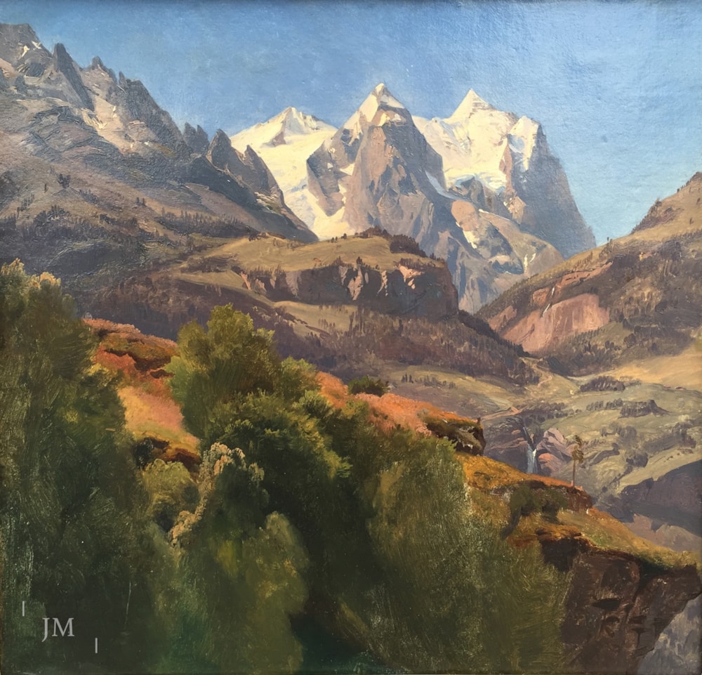 Having moved to Munich in his youth Steffan became known as the ‘German Calame’ although he was born in Zürich. He undertook many painting trips in the eastern part of Switzerland, in particular in Graubünden. This small canvas is a complex composition looking east towards the Wellhorn and Wetterhorn from the Hasliberg. It is one of the most classic and oft painted panoramas by Swiss and German nineteenth century painters – and has changed little since in the last 150 years. Together with other pictures by Steffan this Wetterhorn view was much admired in the exhibition entitled: Forests, Rocks and Torrents held at The National Gallery in London (2011).