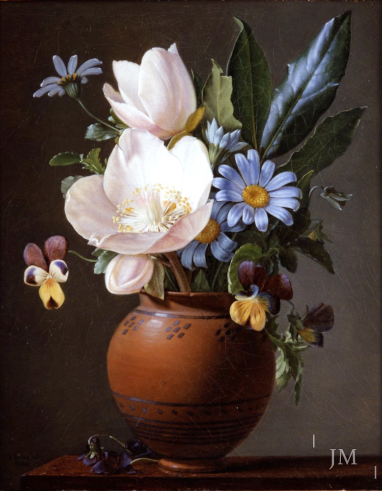 This exquisite flower painting epitomises the achievements of the Lyons school of flower painting in the first half of the nineteenth century, and must have been painted very soon after Thierriat replaced the great but mercurial Antoine Berjon as ‘Professeur Classe de Fleur’ at the Ecole des Beaux-Arts de Lyon, a post which he held until 1853. He was a man of wide interests and civic duties, and certainly the most influential teacher of flower painting, with over four hundred pupils. His appointment as director of the city’s museum in 1831 further distracted him from his own work. Thus, despite a very long and active life, he left behind few flower or still life paintings; hence their rarity today. Although not officially a pupil of Berjon, there is no doubt that Thierriat was the heir to the great artist in so far as anyone could be. In this, small, sophisticated painting he succeeds, like his mentor, in expressing himself through his subject matter with calm and mysterious subtlety.