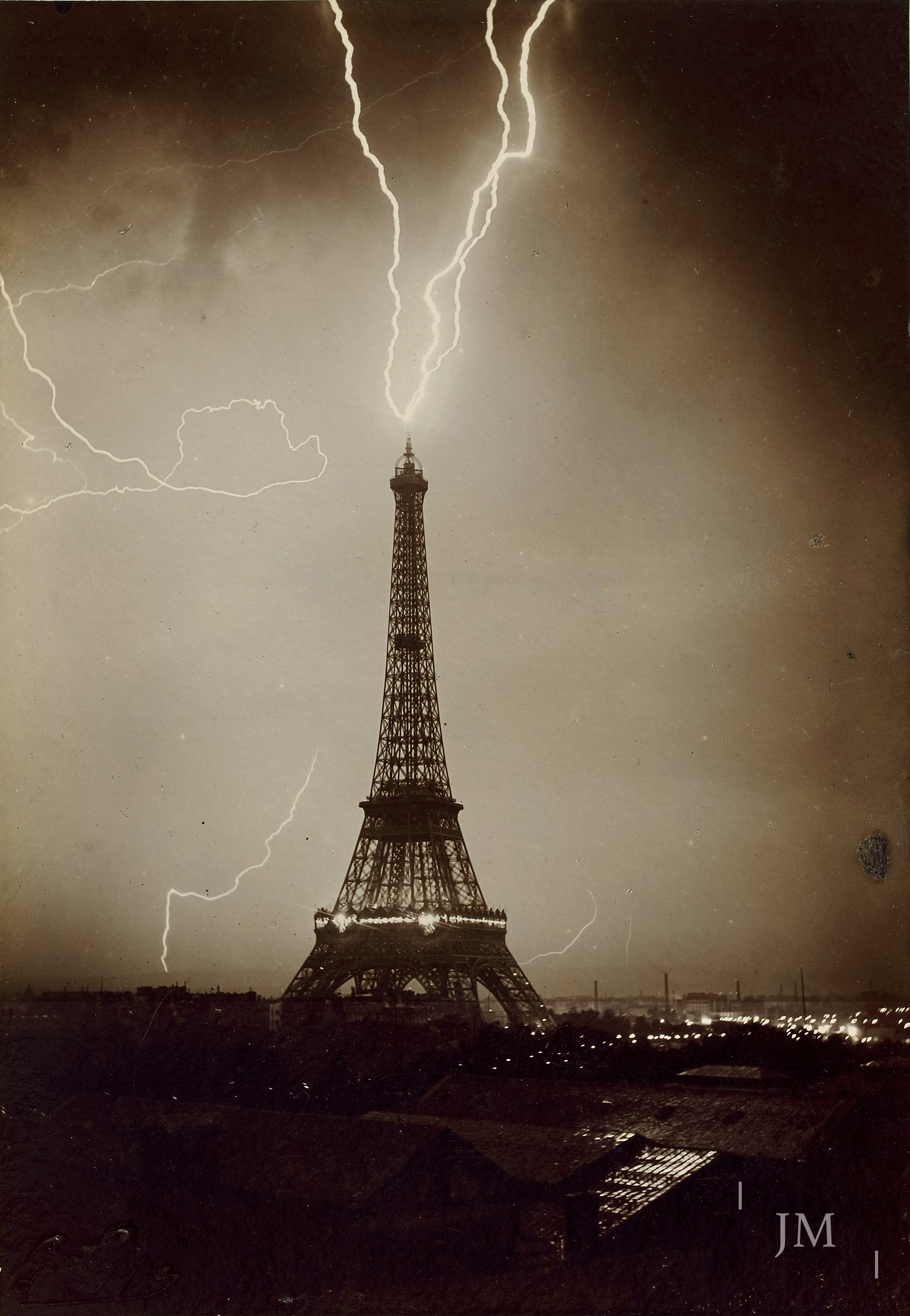 ‘Sir, Mr. Milan sent me the fine photograph of the Tower taken during a storm on June 3rd, 1902. I cannot imagine anything so perfectly outstanding as this and thank you wholeheartedly for making sure that I was sent it. I would simply like to know if the three bolts of lightning hitting the tip were taken in one go or resulted from a series of strikes exposed over a certain period. I am therefore intrigued to receive more details of how you did this and thank you in advance for whatever you can tell me. Yours most faithfully, G. Eiffel.’