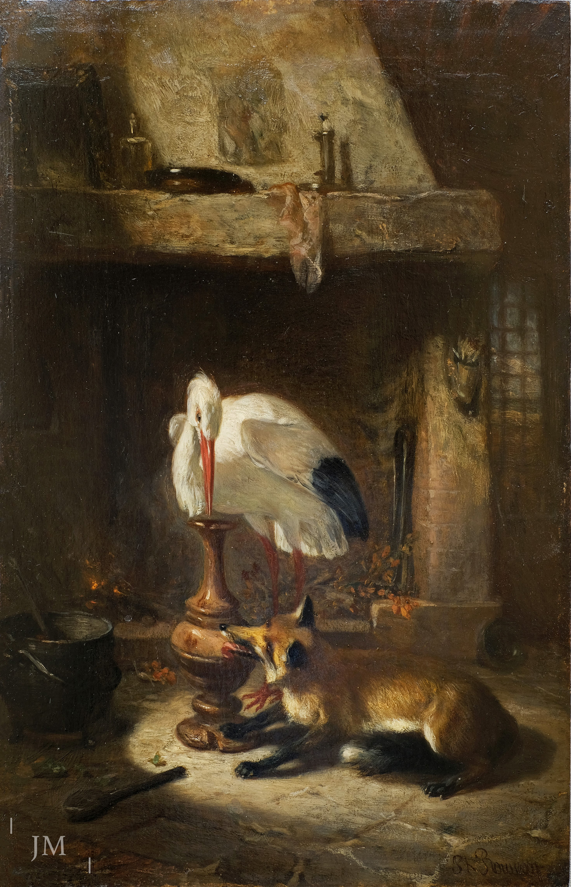 The Fox and the Stork is the third vulpine ‘fable’ painting by Philippe Rousseau to have featured in Gallery Notes, the others being The Fox and the Grapes and The Fox and the Raven. The similar dimensions of the panels would suggest that Rousseau worked on a ‘fox’ series. In this instance, the theme follows the maxim: ‘Do to others what one would wish for oneself.’