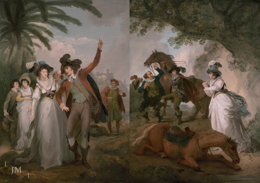 One of the Taming of the Shrew pendants is from Act. IV, Scene 1, the one with the fallen horse; Katherine entreats Petruchio, who is admonishing Grumio with his riding crop; the other comes from Scene 5, and shows the argument on the road about the sun, with Petruchio, Katherine and Hortensio walking in a landscape, the Umbrian hills and a campanile in the background. Ibbetson’s renditions appear to be very much in keeping with the other known paintings for Boydell’s ‘Gallery’ and are particularly close to those of Francis Wheatley (1747-1801). Wheatley, whose art sometimes brings to mind that of Ibbetson anyway, produced thirteen pictures for the ‘Gallery’, and it is worth noting that the smaller ones were of exactly the same dimensions as ours, distinctive for being not quite the regulation 30 x 25 inch standard size of the time. The composition, expression and colouring are tasteful, and yet Ibbetson knows enough theatre to pose his figures dramatically, and although there is marked characterization in Petruchio threatening his servant, Ibbetson generally uses gesticulation rather than expression to indicate action, and in this he was not alone.