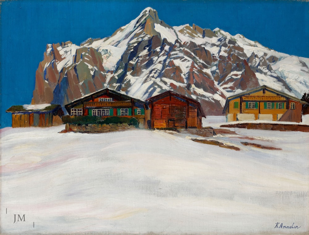 Although Anneler trained as a decorative painter for theatre companies in both his native Bern and then in Münich, by 1910 he had established himself as an independent landscape and portrait painter. He lived in the Lötschental Valley for nearly twenty years where he specialized in landscapes of the Bernese Oberland and recording traditional genre scenes from village life, specifically, weddings and processions. Despite the increase in the number of homes built today, thanks to strict building regulations in Grindelwald such views as shown here of chalets with the Wetterhorn as a backdrop are still common. Anneler’s work is represented in the Swiss Alpine Museum in Bern.
