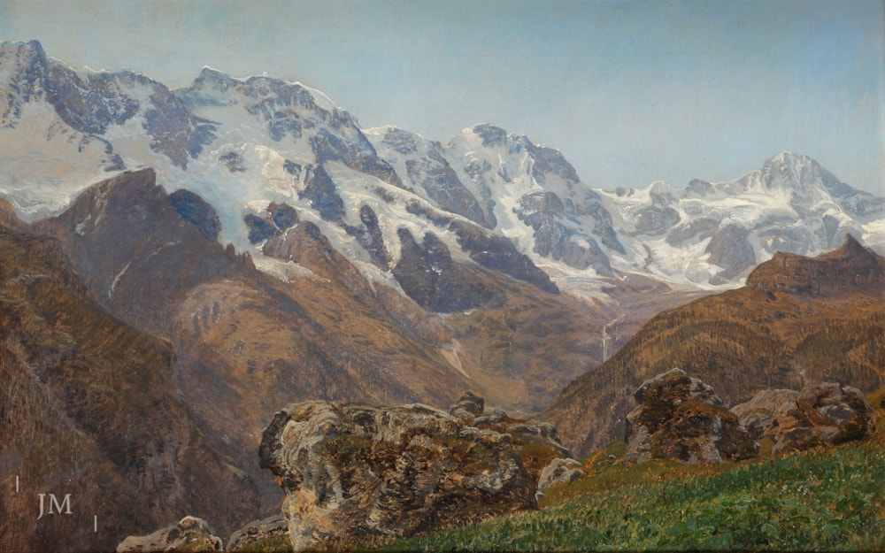 Lacour’s soft treatment of light and contrast in his landscape paintings was a direct legacy of the ‘Golden Age’ in early nineteenth century Danish painting. The painter travelled widely in the Alps and in southern Italy but his compositions suggest utter stillness with no trace of human activity. Despite his traditional, academic grounding, Lacour, nonetheless, approached his Alpine scenery with a more modern eye for vantage points. In this instance, perched above Mürren, Lacour was only protected from the cliff edge by a large boulder which lends dynamism and drama to the view across the valley to the Grosshorn and the Breithorn.