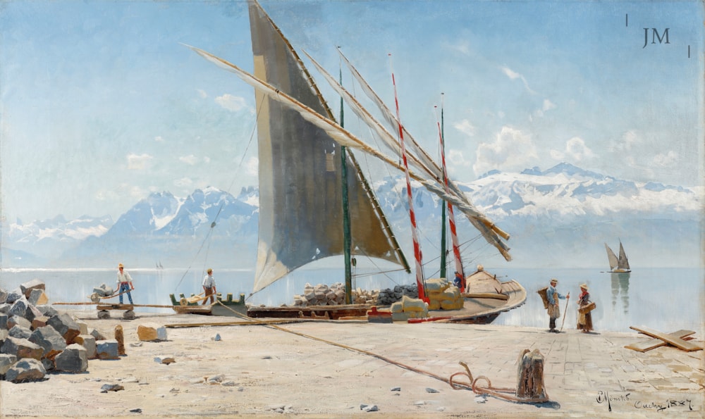Although Mønsted often opted for a conventional composition in most of his Swiss works, in this canvas he veered into a more daring arrangement with a marvellous interplay of perspective and the zig-zag of the varying masts. Using the strong diagonal created by the barge’s anchor rope, Mønsted echoed the lines in the three rolled sails. The complex pictorial planes against a double horizon formed by the quay and the lake, are offset by the sheen of the water and mountains.