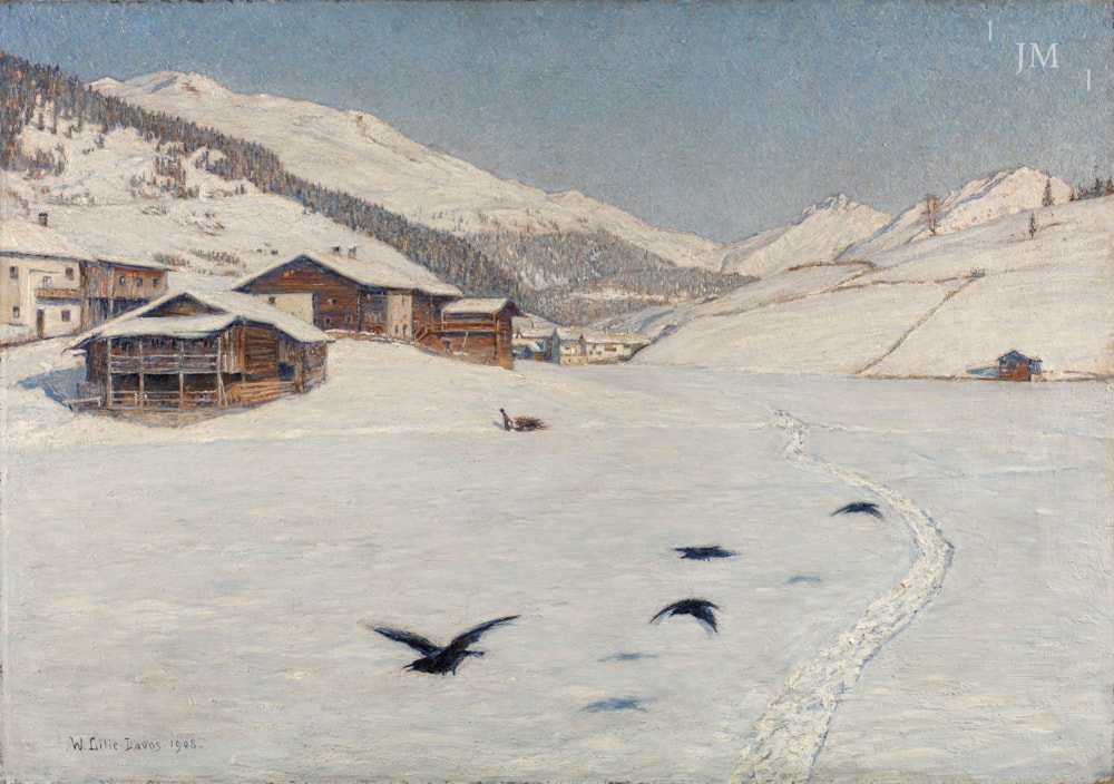 Facing north, looking towards Klosters and its surrounding peaks, Lilie painted this wintry landscape from a meadow near what is now Davos’s golf club. This is a beautifully executed canvas and seems inspired by the Divisionists’ paintings. By 1910, the Divisionist movement had already peaked in popularity having developed from and alongside Pointillism. Aiming to maximize luminosity by dividing colours rather than mixing them, the technique seemed ideally suited to alpine scenery and its greatest exponent was perhaps the epitome of the mountain lover himself, Giovanni Segantini; of all the alpine painters in European art, Segantini’s work is now by far the most valuable. It was the northern Italian landscapists who championed Divisionism the most and Walter Lilie would have seen many of their exhibitions in Milan, Zurich and Vienna.