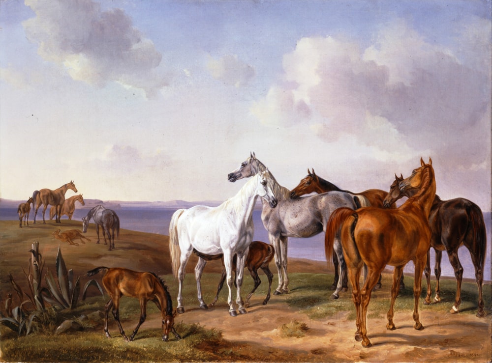 His talents as a horse and soldier genre painter had been excellently developed over his years with the Army and in 1824 the Duke of Leutenburg gave him enough freedom to take on more horse painting commissions. As the co-founder of the Munich Association in 1824, he sought to elevate the previously unesteemed status of ‘Tiemalerei’ – animal portraiture – by abolishing guilds of artists. Adam became more independent towards his subject matter. In 1828 he was painting portraits of the Duke of Schleswig-Holstein’s horses and in the following year, the Arabian horses belonging to King William of Wurttemberg. From the 1830’s onwards his three sons Benno, Franz and Eugen helped him with his work, thereby becoming individually accomplished painters. Between 1848 and 1852 Albrecht accompanied Field-Marshal Radetsky on his campaigns against Italy and also during the Hungarian Revolutionary Wars. By the 1850’s he was working for Kaiser Franz Joseph in Vienna and at the Spanish Riding School.
