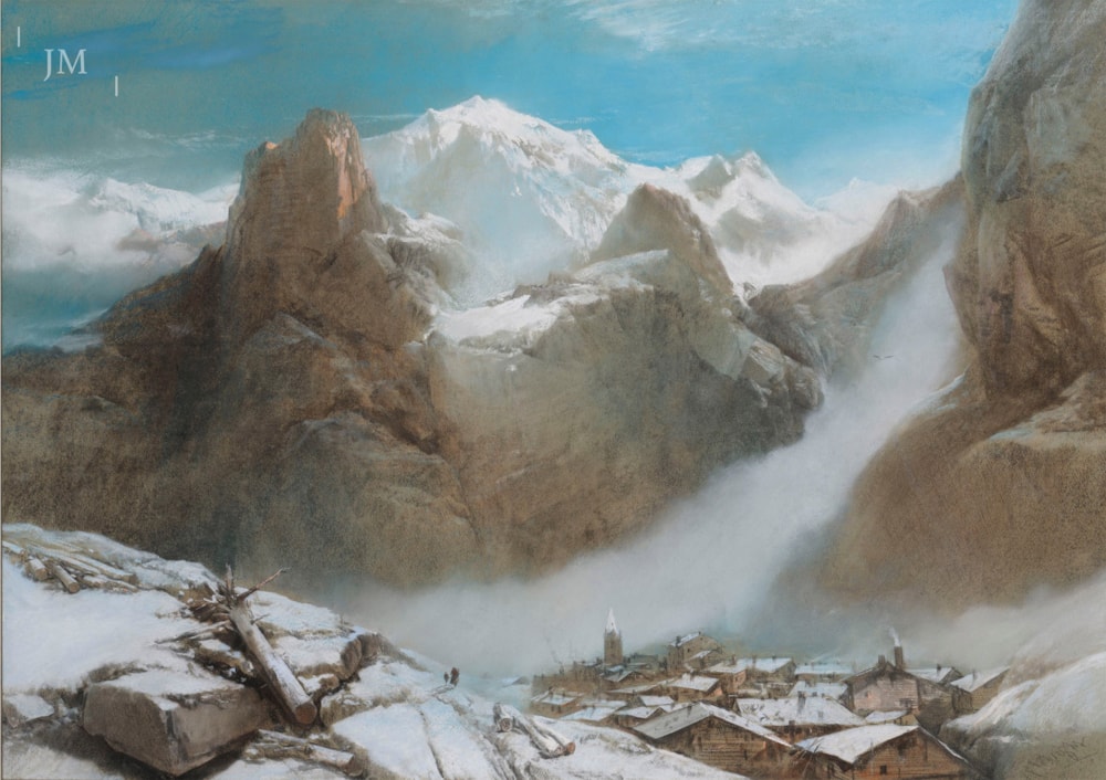 In the vein of the Alpine landscapes by Edward Lear, Elijah Walton and Turner, Bright’s view of the south face of Mont Blanc seen from Courmayeur mixes atmosphere and topography with a specific emphasis, common to the itinerant British painter, on the sublime aspect of the scene. An ominous cloud of spindrift and fog plunges down the couloir to the right of the village overseen by a wheeling vulture. With its distinctive parish church, San Pantaleone, appears dwarfed by the arena of surrounding mountains.