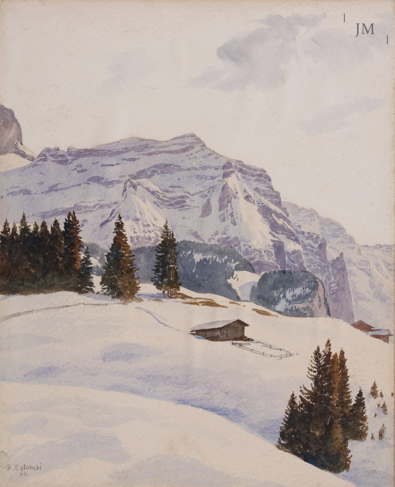 The patches of grass and the bare trees suggest a late winter or spring in this accomplished watercolour which relies on delicate washes of ultramarine violet to replicate the undulating meadows under snow. Colombi made this sketch from Mettlenalp just beyond Wengernalp where the Jungfrau descends into the steep Lauterbrunnen Valley and behind this flank of mountain emerge the famous Trummelbach Falls.