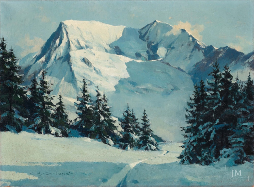This late afternoon scene by Contencin was painted near Bionnay situated on the Route des Contamines between St. Gervais and Les Contamines. A band of mist has descended over St. Gervais and to the north the sunlight is catching the Aiguille de Varan which towers above the town This remains a somewhat secluded valley lying between Megève and Chamonix and a 15,000-acre nature reserve was set up in the 1970s to protect the area. The rimy Bon-Nant river, captured in a passage of sap green, flows into this wintry landscape which is suffused with hues of pink to capture the declining light. The canvas’s reddish priming combined with the tinted areas added to the forested slopes, the snowfields and rocks, make for a subtle and beautiful recollection of the Savoie.