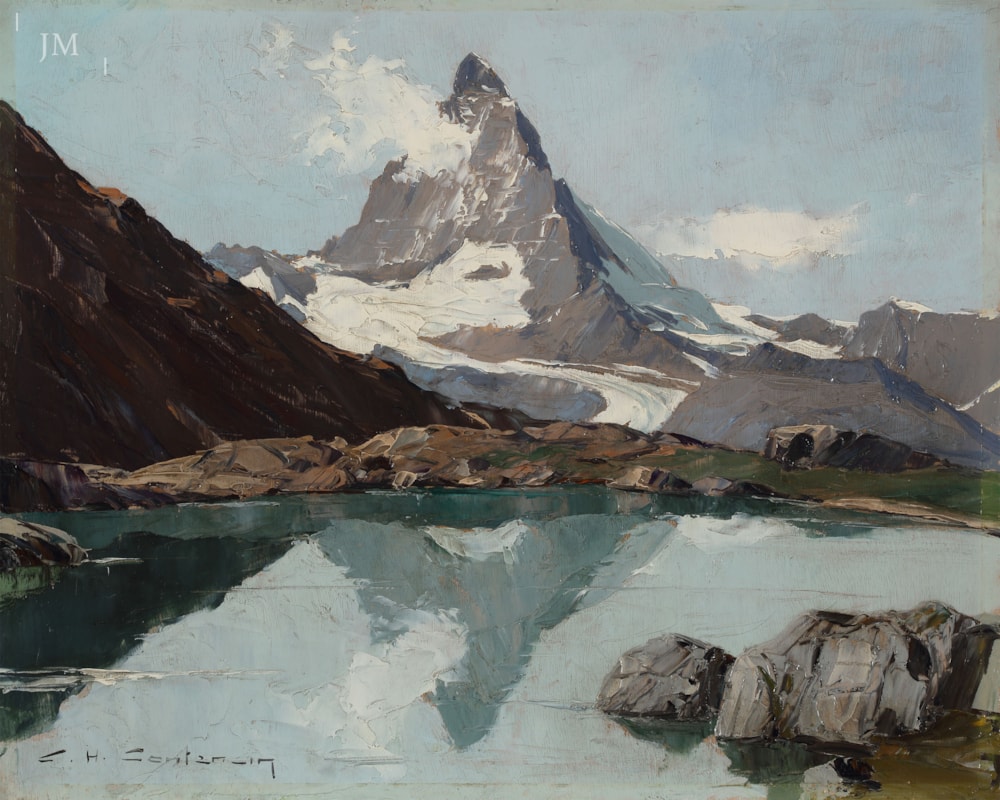 The dark triangle of the Riffelhorn casts a deep shadow and reflection over the Riffelsee which, in turn, mirrors the inverted pyramid of the Matterhorn far off across the Gornergrat. In this satisfying and bold composition Contencin managed to conjure up one of Zermatt’s most famous views with an orange primed panel and his trusted palette knife. The lake is laid in with horizontal bands of paint and the Matterhorn painted in a refined mix of cadmium red and ultramarine to render as accurately as possible the purple gneiss rock caught by the midday sun. A tweak of the palette to a greener hue separates the mostly clear sky from the smooth surface of the icy lake. Contencin could rely on a lifetime’s experience in the mountains to be able to sketch such an oft repeated moutainscape this convincingly.