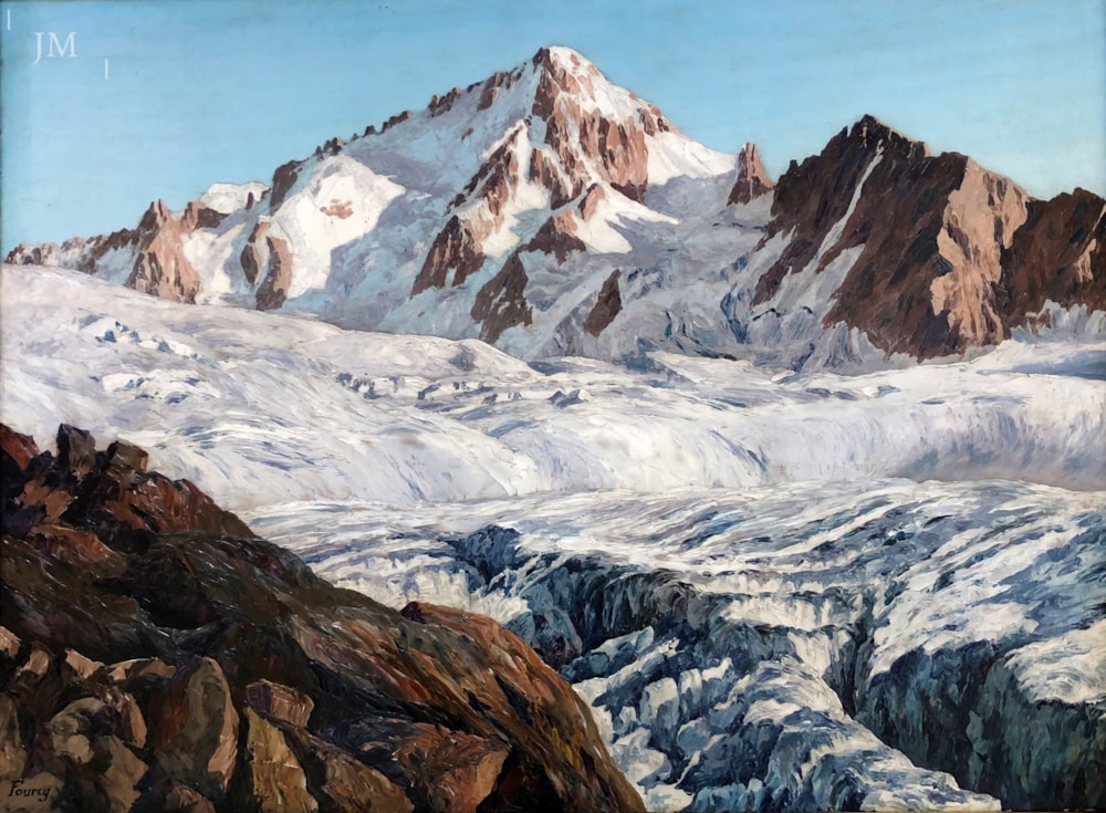 As an engineer by training, Fourcy had a successful career working for the French railway network, Compagnie Paris- Méditerranée Lyon- or PLM, before enlisting in the army. Despite losing an eye in WWII in 1940 and spending five years in a Rhenish prisoner of war camp, he was the longest active member of the Société des Peintres de Montagne, exhibiting there nearly every year from 1925 to 1990. Fourcy learnt to paint by himself and relied exclusively on a palette knife generously loaded with paint to recreate the seracs, glaciers and couloirs so familiar to him as a peintre-alpiniste and it took considerable skill to avoid over saturating the colour and tone. Fourcy’s experience from a lifetime’s climbing gave him an advantage in calculating the strength of shadows at altitude and especially in a late afternoon scene such as in this picture. His foregrounds tend to juxtapose the receding composition perfectly. The Aiguille du Chardonnet boasts an impressive north face which offers some challenging climbing routes, including the Migot Spur and at 3842 metres, the peak’s lower altitude in relation to its neighbouring mountains to the west means that it tends to have a lower footfall even in the busier Alpine seasons.