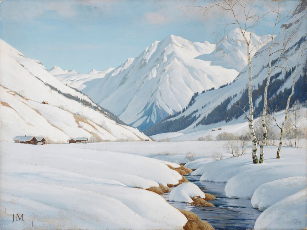 Kessler was a specialist watercolourist of mountain scenery and worked throughout the Tyrol and the Engadine. Although his pictures seem deceptively simple and softly executed, the wide expanses of snow are formed of many subtle washes, graded to convey the distribution of light on the blanketed meadows and slopes. Kessler favoured clear, cold days and his skies are often dappled with yellow ochre clouds. This wintry watercolour depicts the view along the valley due east from the Monbiel hamlet in Klosters; from right to left are the peaks of the Wisshorn and Canardhorn.