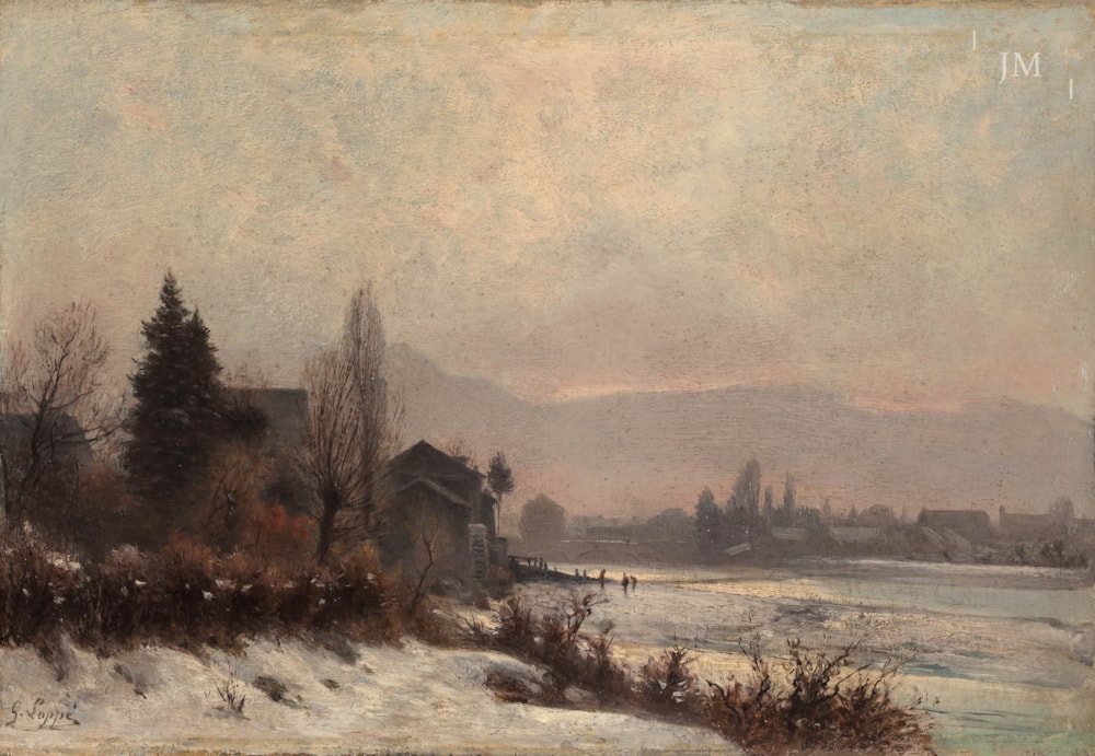 Loppé’s wintry oil study depicts the meeting point between the Rhône and the Arve rivers. A tourist hotspot in the summers, the contrasting colours at the rivers’ confluence are remarkable. The silted and creamy coloured Arve river descending from above Chamonix clashes with the turquoise waters of the Rhône as it empties from Lake Geneva bound for Marseille. With great skill Loppé captures here the deep and set-in cold amidst the shrubbery and poplars that line the river. A few people can be seen out on the frozen river by the watermill and the towers of Geneva’s cathedral can be indistinctly made out in the far distance.
