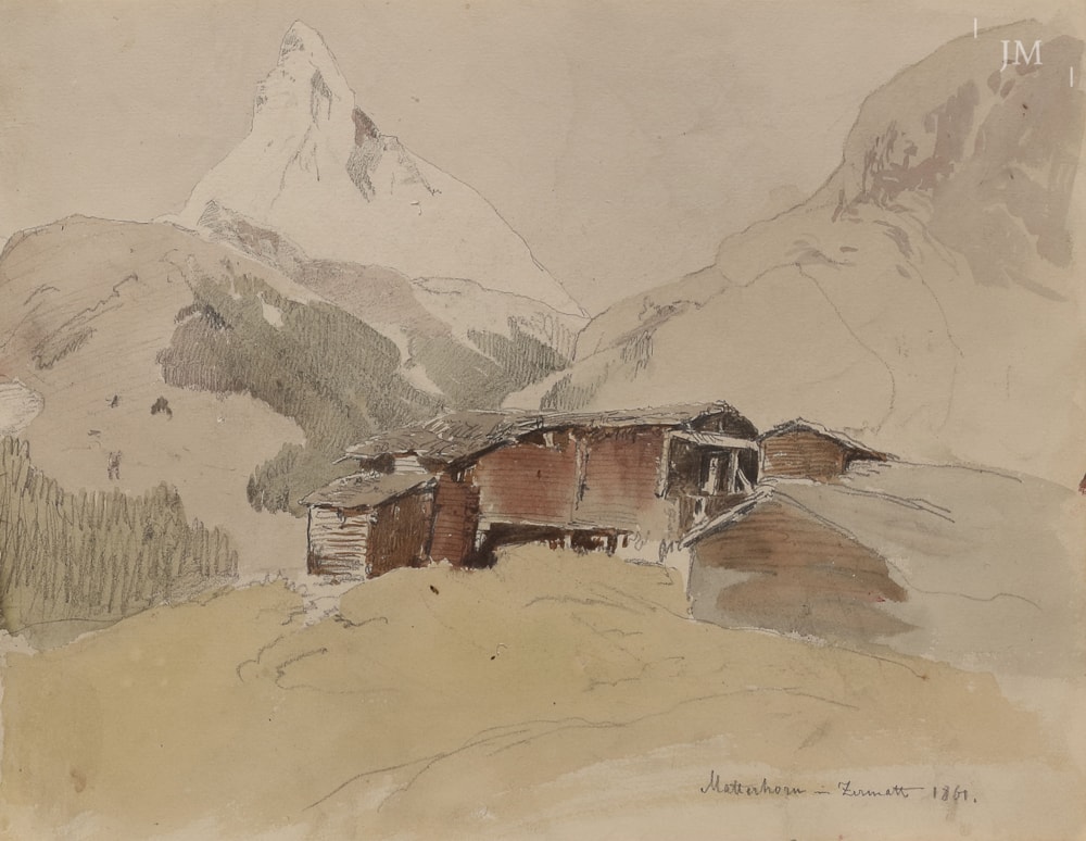 This fine watercolour of the Matterhorn is taken from one of Schiess' working sketchbooks. Despite its popularity later in the century, at the time this drawing was made, getting to the valley and village of Zermatt was an undertaking on its own.