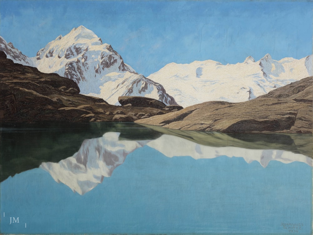 This is the panorama that greets walker and ski-tourer alike a few hours climb above Silvaplana. The lake is at 2760 metres above sea-level and Piz Roseg is on the left with the Sellagruppe to the right. It is one of the finest views in the whole of the Alps and Schütz has depicted it as if on a completely still day; the peaks’ reflections in the lake are almost symmetrical. The slabs of granite have come out in a murkier green when seen mirrored in the lake.