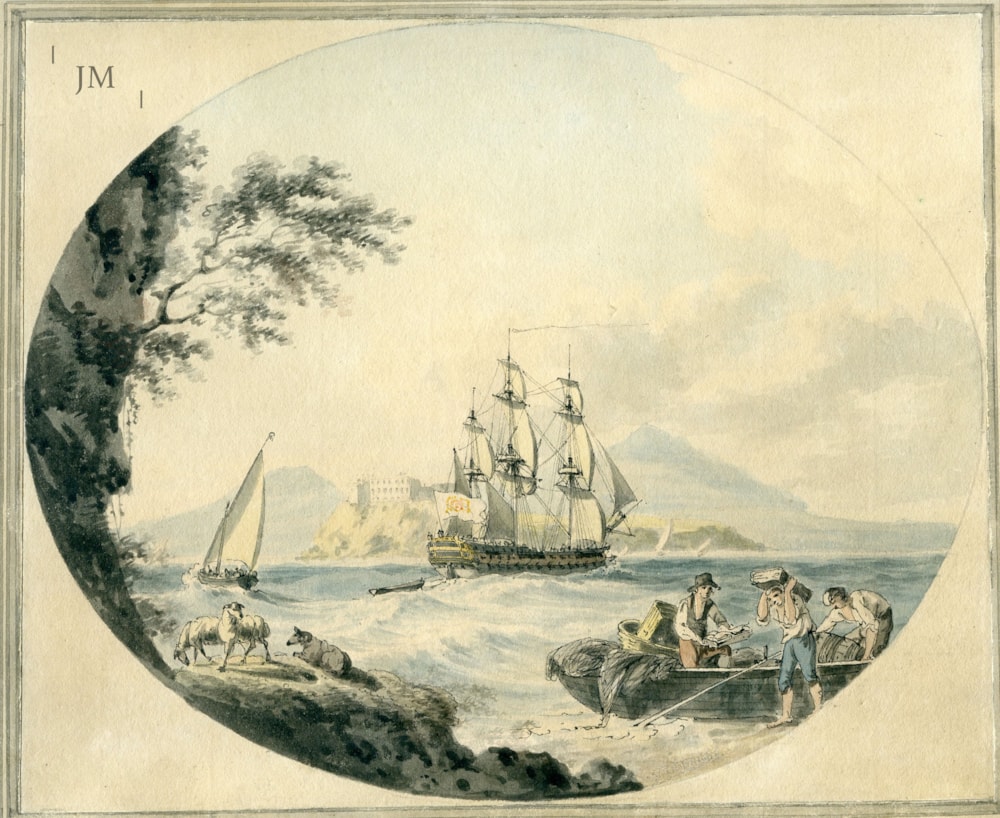 These are typically accurate scenes from Serres’ memorable voyage through France and Italy in 1790, drawn in his very distinctive inky style. In the first he has made a point of including the abbey of San Michel Arcangelo on Procida. Note, too, his attempt to render the rather elaborate ensign of the Kingdom of the Two Sicilies at the stern of the man o’war. Serres would later follow his father, Dominic Serres (1725-1791), and become ‘Marine Painter to HM the King’.