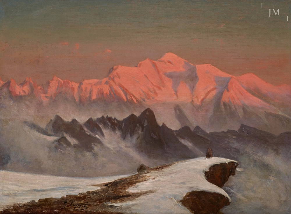 Made on top of Le Buet, facing Mont Blanc, Loppé used this sketch to paint an enormous canvas which now hangs in Chamonix’s Le Majestic. At two and a half metres wide, Coucher de soleil sur la châine de Mont Blanc is a splurge of smouldering orange, red and dark shadows. When comparing the study with its large counterpart, it shows how adept Loppé was at transposing the effect of the setting sun; the strength of the shadows and the colours’ values even on such a small scale. His topographical accuracy was as precise as ever.