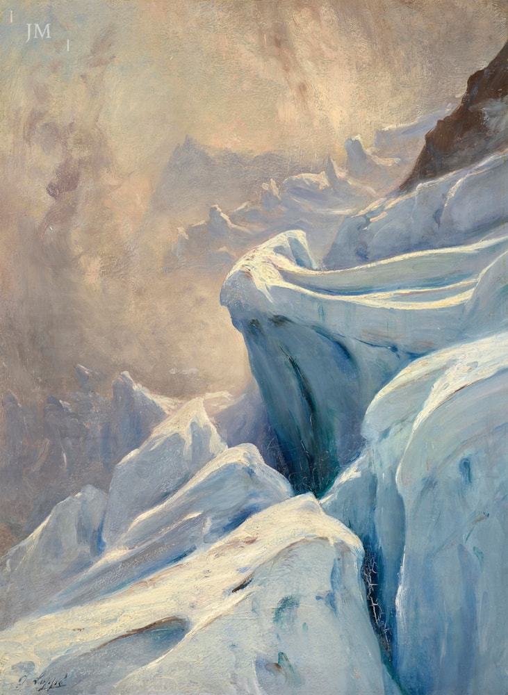 From a faded old label on the picture stretcher giving an address at 12, Kings Bench Walk, it has been established that this hitherto lost crevasse painting, together with the Sunset on Le Buet, belonged to Loppé’s great friend and climbing partner, Sir Alfred Wills. The two men first met in Chamonix in the early 1860s and became firm friends. Thanks to Wills, Loppé was made the first foreign member of the Alpine Club and as a result began exhibiting his pictures there. Both studies in this year’s catalogue were shown in London in 1878 and this Bossons picture was most likely hung next to its gigantic offspring, the four- metre canvas which now hangs rather incongruously in a conference room in Chamonix’s Le Majestic. As one of Loppé’s most famous and certainly most ambitious compositions, it was the star attraction of the town’s Musée Alpin collection until the terrible fire ravaged the building in 1999, destroying more than forty of his works. It is worth noting that Loppé included the climbers and their ladder in the finished picture to create scale or indicate the size of the enormous serac jutting off the glacier. And this is doubtless why he chose to paint the Aiguille du Midi in the background. Since the lifespan of such advanced ice shelves as shown here is brief, one of the most valuable consequences of finding these two studies, in particular Crevasses below the Grands Mulets, is the further validity they give to Loppé’s legacy as a peintre-alpiniste who worked from the motif at all times.