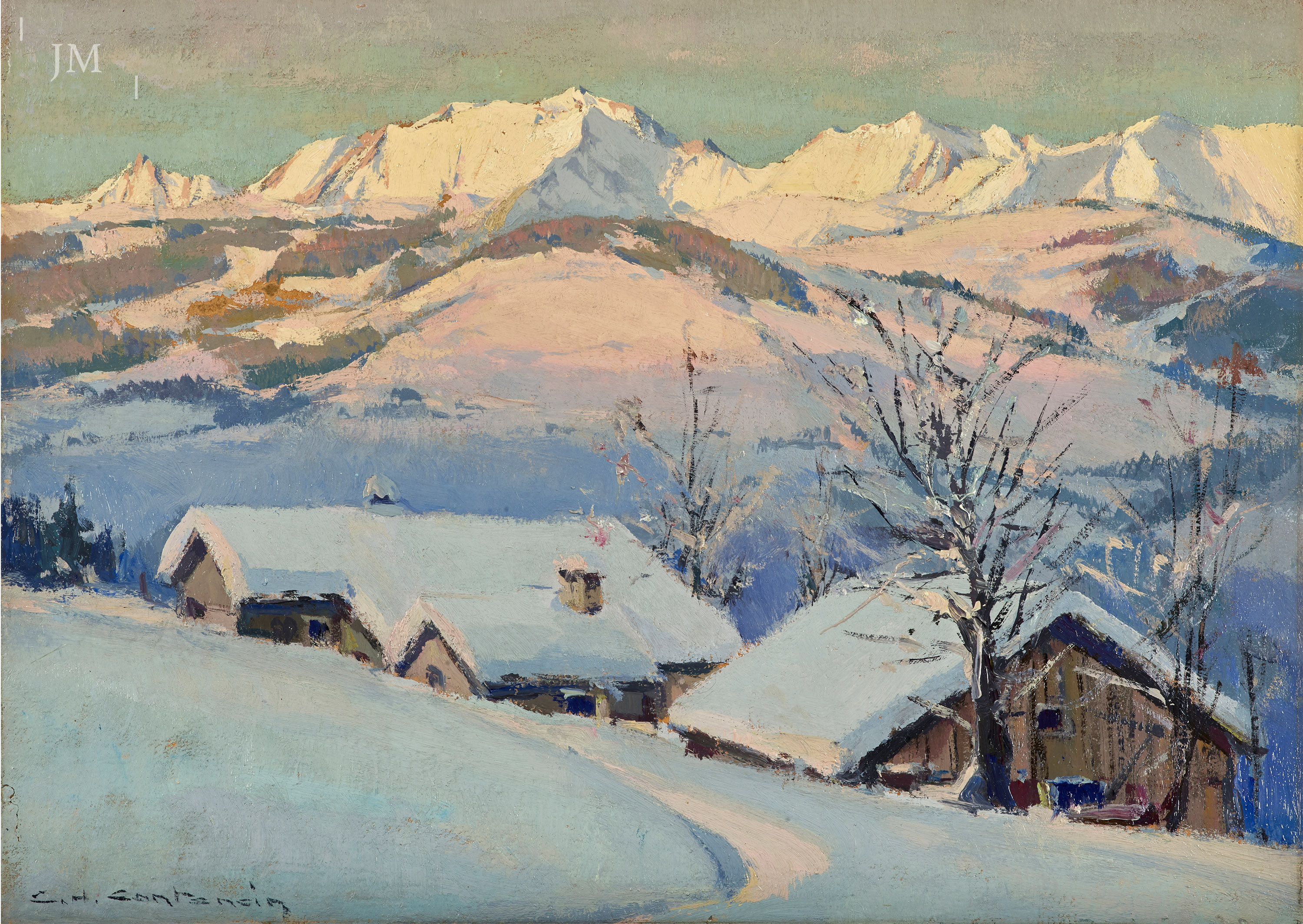 The Aiguille du Midi is on the far left of this composition which depicts the whole chain of Mont Blanc seen from near the Croix des Salles above Megève.