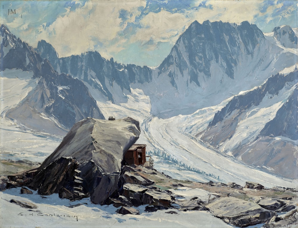 The view towards the Grandes Jorasses across the Mer de Glace must rank as one of the best panoramas in the Alps. At just under 2,700 metres the location of the Couvercle Hut takes a decent glacier traverse and some exposed sets of ladders to get to, and thus the view rewards the more dedicated walker and climber. The first refuge was built on the original bivouac site under the Rocher du Couvercle, - the obelisklike rock overhanging it. In 1932, after Contencin painted this picture, the refuge was moved seventy metres away to a promontory overlooking the Mer de Glace and the Tacul and Talèfre glaciers.