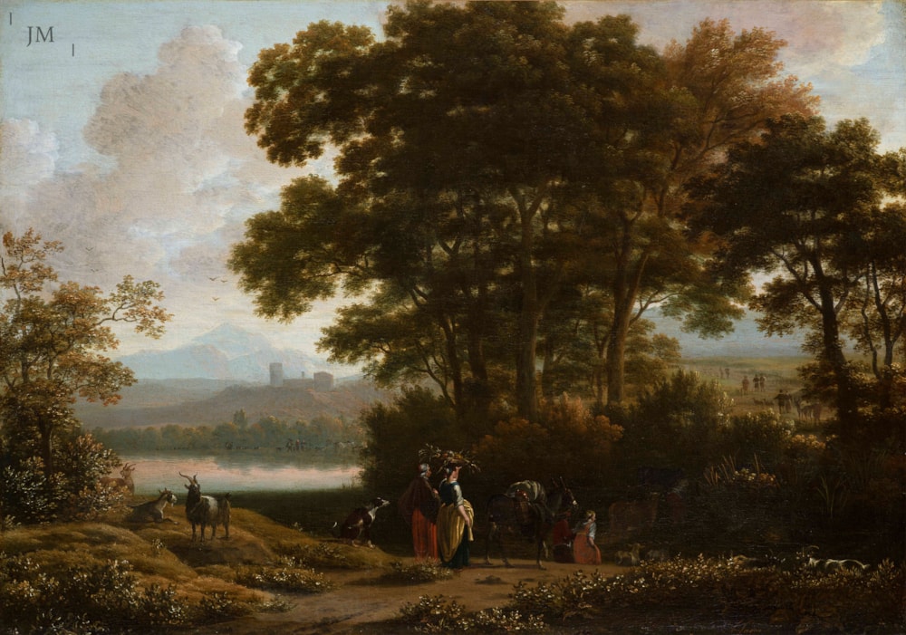A painter of woodlands, townscapes and panoramas van der Haagen most likely studied with his father, Abraham, before moving to the Hague in 1639 where he joined the St. Luke’s guild in 1643. His delicate drawings form an important part of his artistic output; proof of fairly extensive painting trips in the southern Netherlands, Rhineland Germany and France. Views and recurring motifs from the landscapes of Kleve, Arnhem and Maastricht in particular, feature in many of his paintings. View of the Swanenturm, Kleve (The Rijksmuseum, Amsterdam, inv.c.138) is one of his best known pictures. Since van der Haagen did not paint his own staffage, it is more than likely that the drovers and travellers with their livestock in the foreground were painted by Ludolf de Jongh (1616-1697).