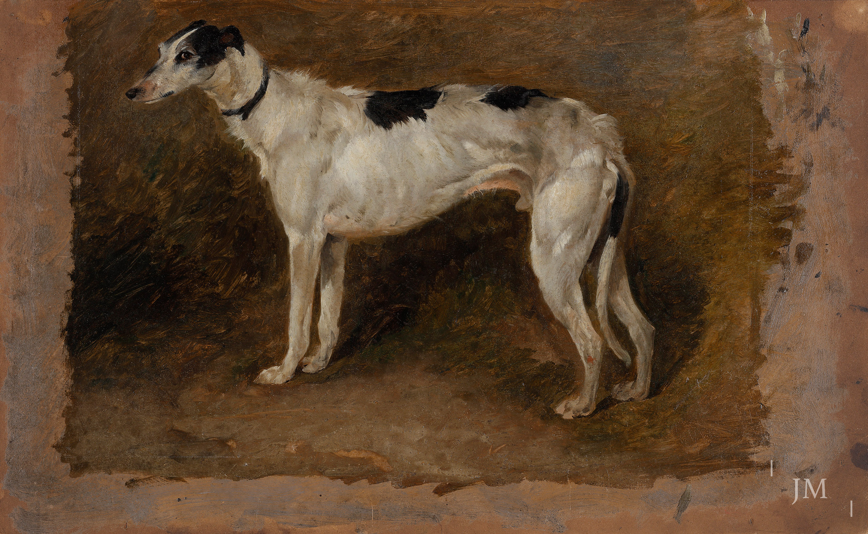 Our painterly sketch can be compared with similar, small oil studies, for example Study of a working horse at the Yale Center for British Art and Border Collie at Canterbury Art Galleries. As well as having that quality of the exceptional in Cooper’s otherwise rather repetitive oeuvre, our lurcher was presented with three other oil on paper animal studies by our distinguished and much missed colleague, Andrew Wyld, in 2006. A sketch of a stallion was dated 1830, and Andrew felt that all four works dated from the same period.