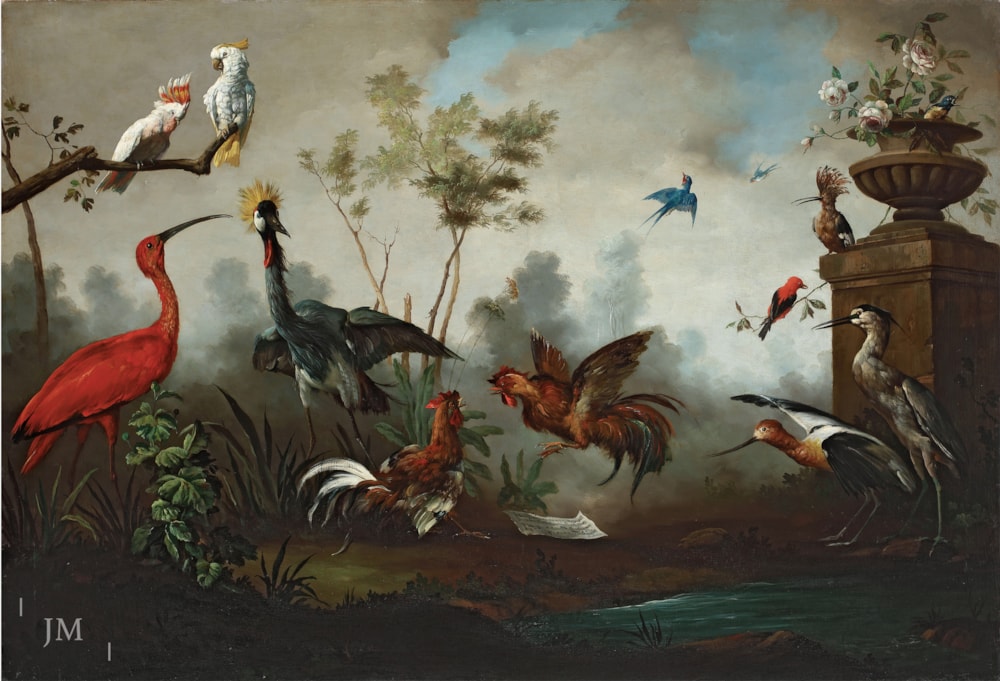 A Concert of Birds: a scarlet ibis, cockatoos, a crowned crane, a hoopoe and other birds in a parkland setting